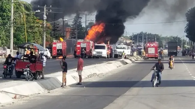 LA VEGA. Un camión de gas explotó en la Autopista Duarte en el sector El Llano de La Vega, causando un incendio de grandes proporciones que afectó a varias estructuras y destruyó tres vehículos.