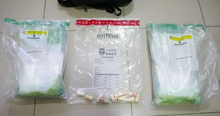 En presencia de un fiscal, se procedió a requisar una mochila en cuyo interior se ocuparon camufladas, dos paquetes de cocaína en forma de láminas, con un peso de 3.37 kilogramos.
