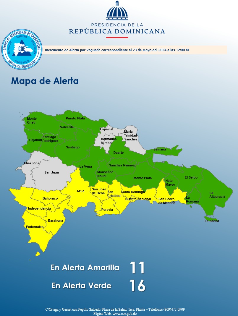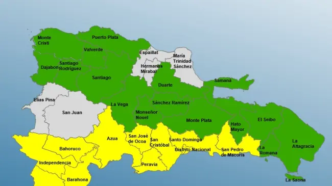 En tanto que en alerta verde se encuentran La Romana, El Seibo, Sánchez Ramírez, Monte Plata, Duarte, Santiago Rodríguez, Santiago, Dajabón, La Altagracia, Hato Mayor, Samaná, La Vega, Monseñor Nouel, Montecristi, Puerto Plata y Valverde.