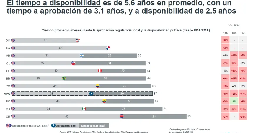 Los pacientes en la región esperan en promedio 5,6 años para acceder a un tratamiento innovador: 3,1 años para su aprobación local y 2,5 años adicionales para su disponibilidad. Además, el 91 % de las terapias no registraron mejoras frente a 2024, lo que refleja una necesidad de dinamizar los sistemas de acceso.