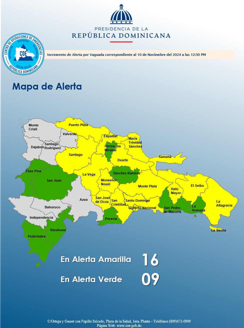 Santo Domingo.– Santo Domingo.- El Centro de Operaciones de Emergencia (COE), informó que debido a la incidencia de una vaguada, aumentan a 16 las provincias en alerta amarilla y nueve en verde.