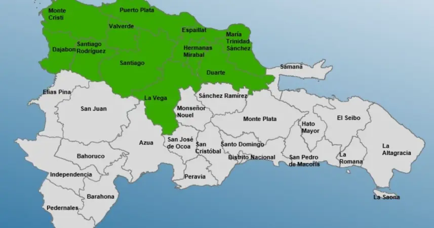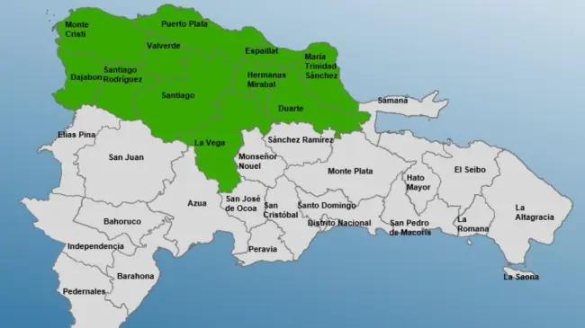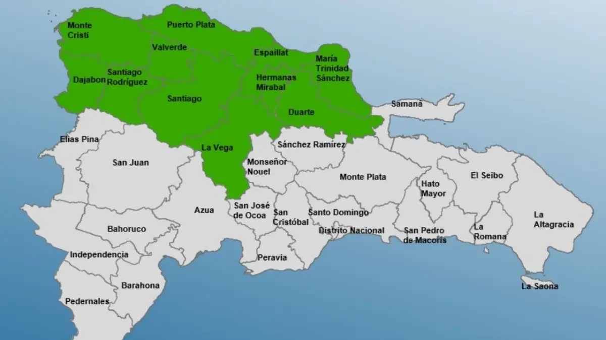 Las provincias en alerta son: Hermanas Mirabal, Espaillat, Montecristi, María Trinidad Sánchez, Puerto Plata, Duarte, La Vega, Santiago, Santiago Rodríguez, Dajabón y Valverde.