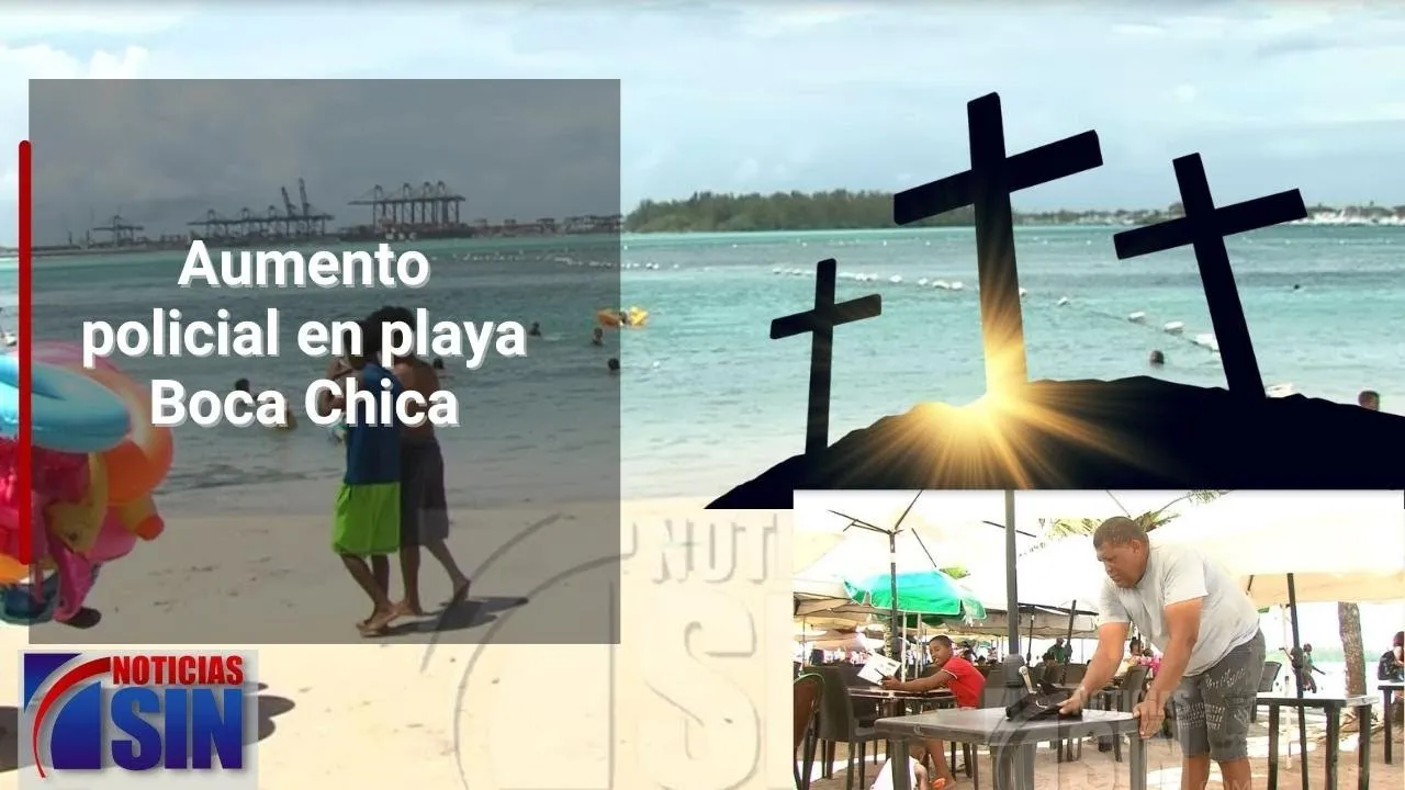 El paisaje de las cálidas aguas azules de la playa de Boca Chica este sábado está acompañado por uniformes, pues aumentó la presencia policial en la zona durante estos días de asueto por la Semana Santa con relación a años anteriores, según los propios bañistas.