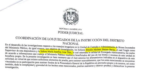 De acuerdo al documento, Batista Barias fungía como supervisor de la entidad, de acuerdo a informaciones que maneja el Ministerio Público resultó al igual que María Josefina Azar Díaz beneficiado del uso de los bienes de esta unidad en beneficio propio.