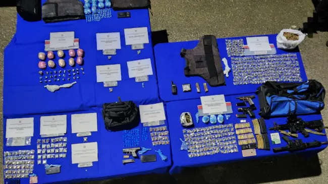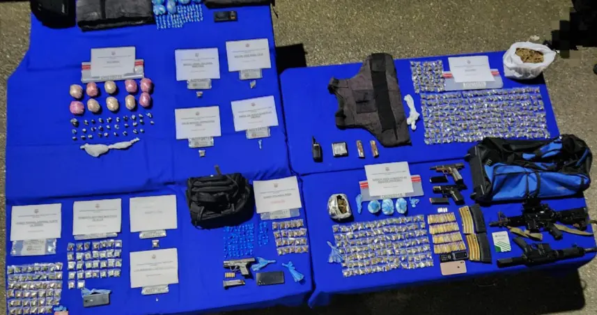Se confiscaron además dos fusiles, tres armas de fuego, municiones, tres chalecos antibalas, una radio de comunicación, cuatro celulares, dos balanzas, una máquina selladora al vacío, dinero en efectivo y otras evidencias.