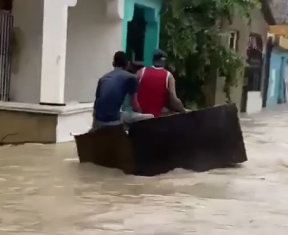Asimismo, en un escenario similar, estas personas también ignoraron las disposiciones de las autoridades y en medio de las inundaciones se trasladaban en la estructura de una nevera, utilizada como un bote, en Sabana Perdida, Santo Domingo Norte.
