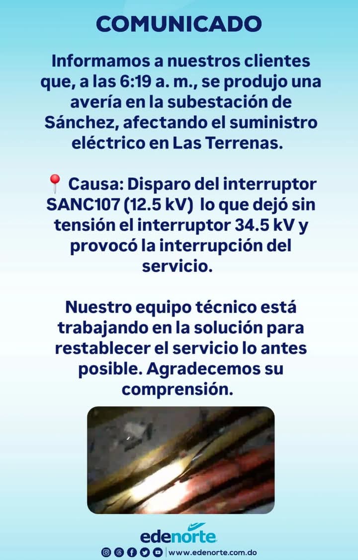 Samaná.- Este miércoles los residentes de Las Terrenas y El Limón, en la provincia de Samaná, se ven afectados por una interrupción en el suministro eléctrico. Según informó Edenorte en un comunicado, el corte se produjo a las 6:19 a.m. debido a una avería en la subestación de Sánchez.