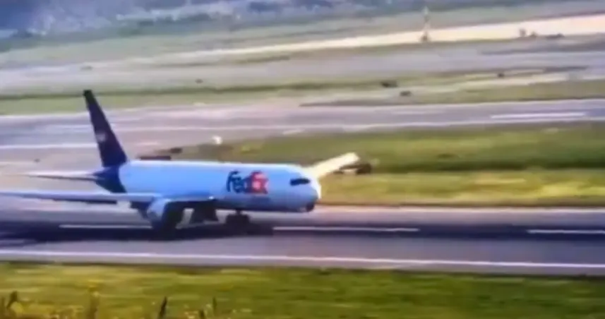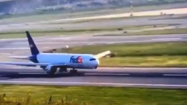 Un video en las redes sociales mostró al Boeing 767 de FedEx Express usando el tren de aterrizaje trasero y luego cayendo ligeramente con la parte delantera del fuselaje.