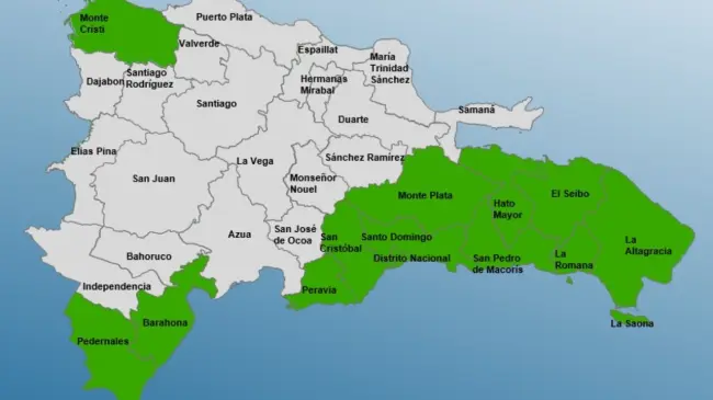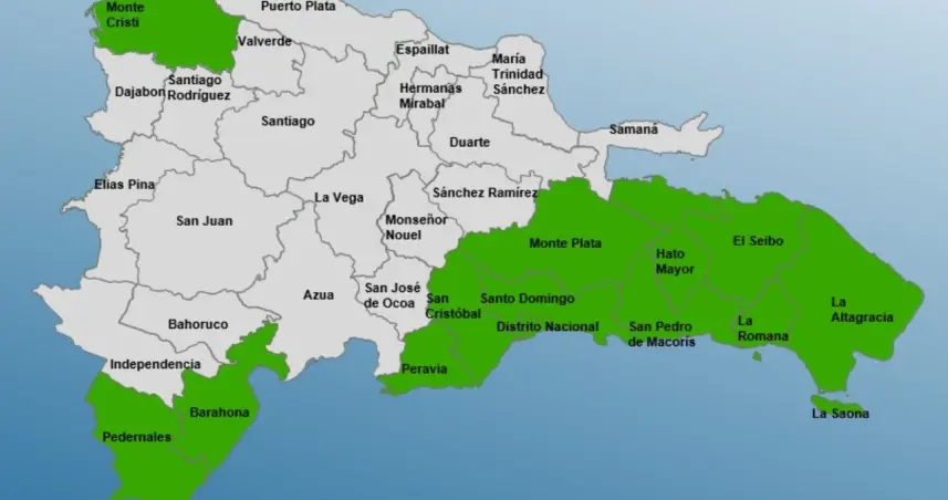 Santo Domingo, Distrito Nacional, Monte Plata, Previa, San Cristóbal, La Altagracia, San Pedro de Macorís, Monte Cristi, Barahona, Hato Mayor, Pedernales, El Seibo y La Romana son las demarcaciones que mantienen la alerta.