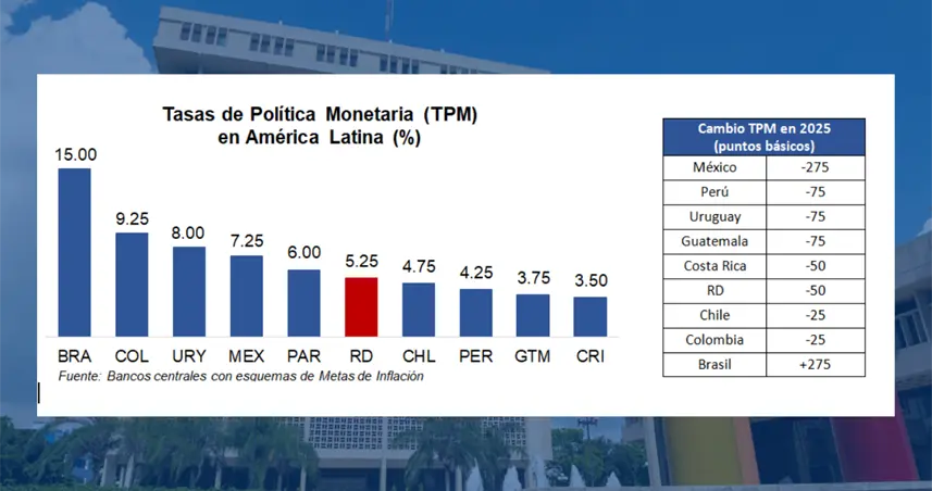 El Banco Central de la República Dominicana (BCRD) decidió mantener su tasa de política monetaria (TPM) en 5.25 % anual durante su reunión de noviembre de 2025. También dejó sin variación la tasa de expansión de liquidez (Repos a 1 día) en 5.75 % y la tasa de depósitos remunerados (Overnight) en 4.50 % anual.