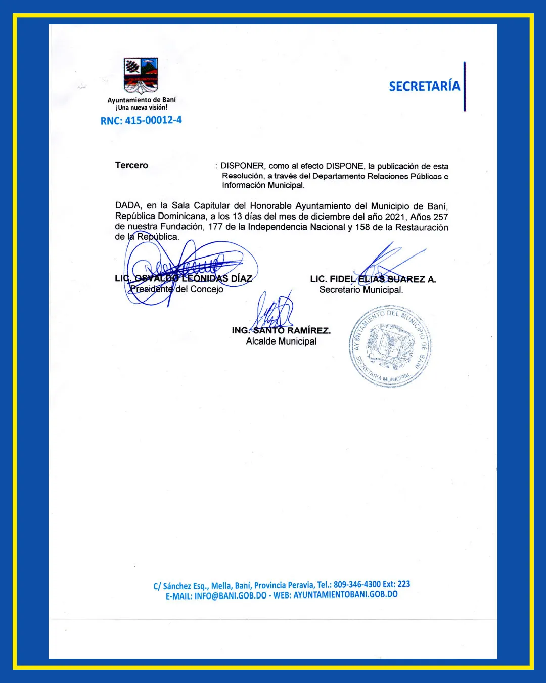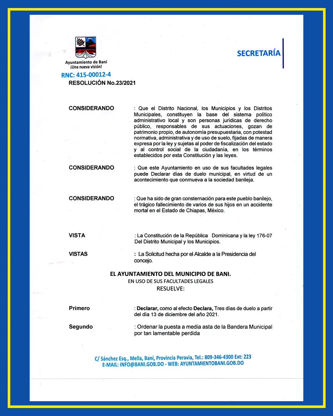 La resolución de la sala capitular de la Alcaldía de Baní explica que hizo la declaratoria debido al hecho trágico que conmueve a la sociedad banileja, por lo que ordenó la puesta a media asta de la bandera municipal.