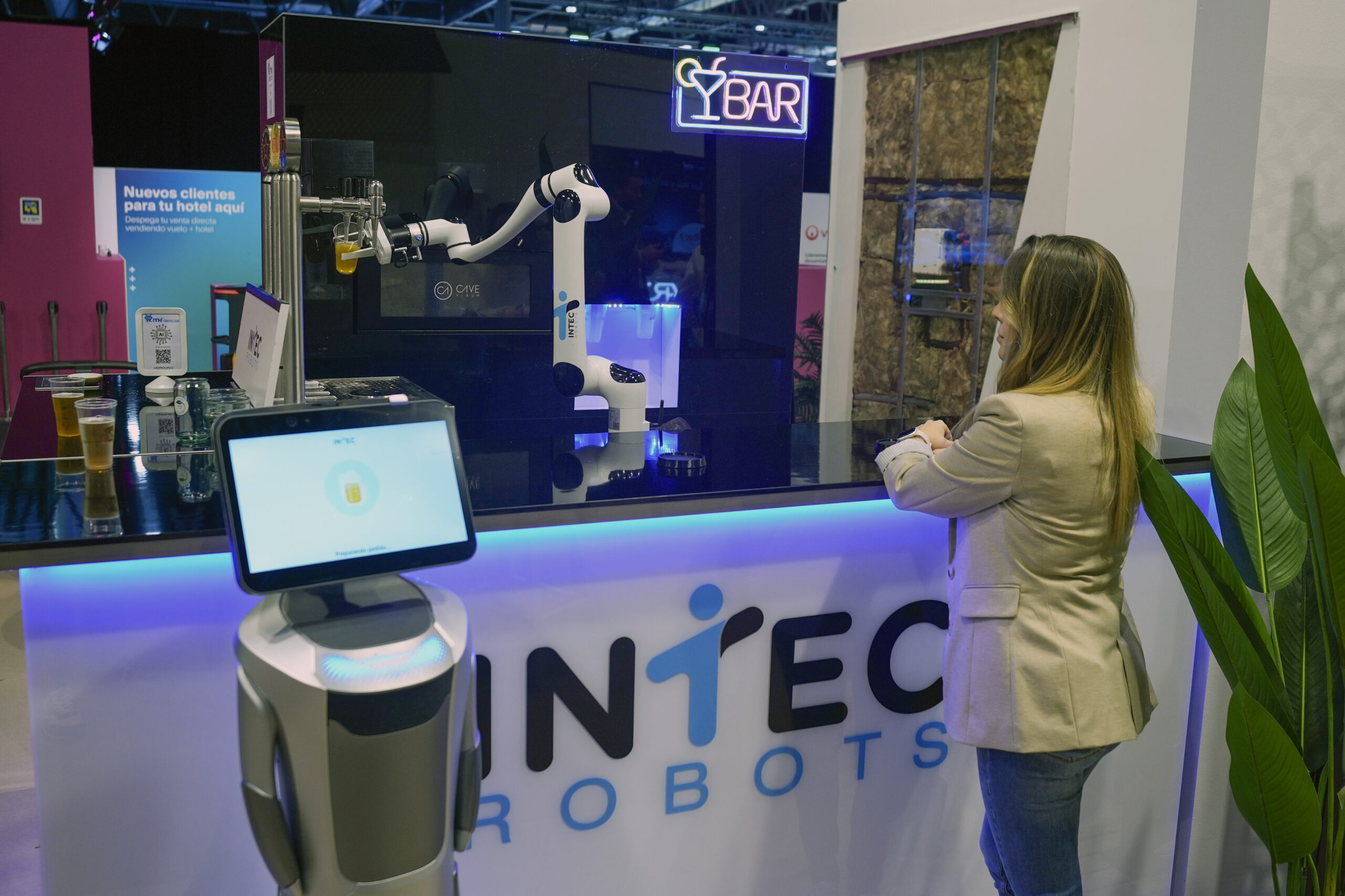 Por su parte, la empresa Intec Robots (Ingeniería Técnica Robótica) de Alicante expone su bar 100% robótico, colaborativo e interactivo, con grifos de bebida automatizados y brazos robóticos que sirven la bebida al viajero.