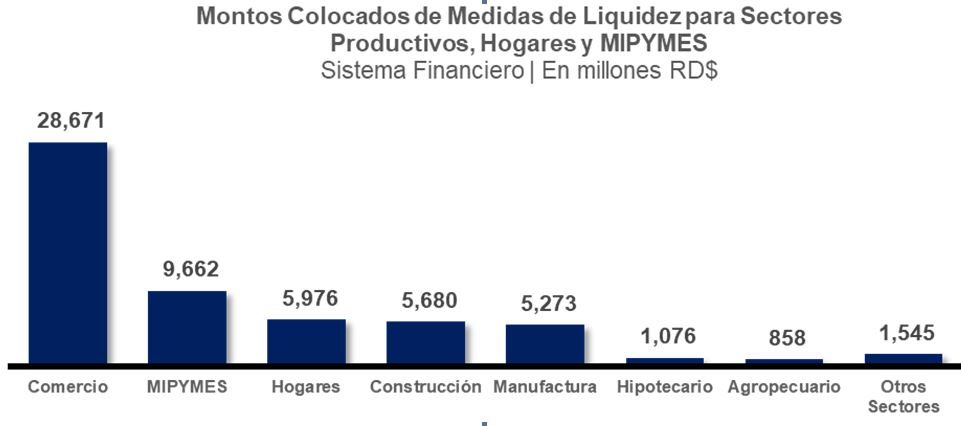 Visto por sectores económicos, los montos desembolsados se encuentran distribuidos en los sectores de Comercio con RD$28,671 millones (un 48.8%), MIPYMES por RD$9,662 millones (un 16.5%), Consumo de los Hogares con RD$5,976 millones (un 10.2%), Construcción por RD$5,680 millones (un 9.7%), Manufactura por RD$5,273 millones (8.9%) e Hipotecarios con RD$1,076 millones (un 1.8%), entre otros.