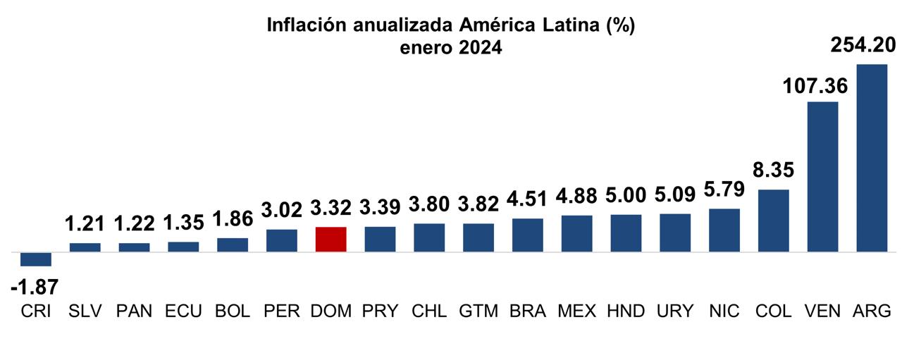 El BCRD indica que, al analizar el comportamiento entre los países de América Latina de la inflación interanual, es decir, en un período de doce meses, la del país se encuentra entre las más bajas de la región. De hecho, si se excluyen las economías dolarizadas (Panamá, Ecuador y El Salvador), la República Dominicana es el cuarto país de inflación más baja en la región en el pasado mes de enero 2024.