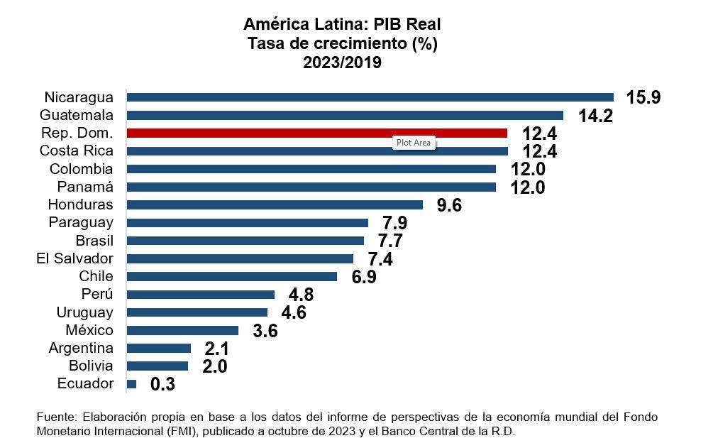 Resulta oportuno puntualizar que, conforme a las cifras oficiales de los países reseñadas por el Fondo Monetario Internacional (FMI) en su último Informe de Perspectivas de la Economía Mundial (WEO, por sus siglas en inglés), este resultado favorable en términos de inflación a nivel regional se ha logrado en el contexto de que la actividad económica en la República Dominicana, medida a través del índice de volumen del producto interno bruto (PIB), exhibe una de las recuperaciones más significativas en América Latina con respecto al año 2019, es decir, el nivel previo a la pandemia, siendo el PIB real de 2023 un 12.4 % superior al de 2019, ubicándolo en la tercera posición con la mayor recuperación relativa en una muestra de 17 países de América Latina.