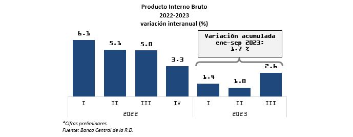 Al analizar la composición de la variación del PIB por actividad, observa que la “Construcción”, sector de gran efecto multiplicador en el resto de la economía y que ha recibido recursos de las facilidades monetarias al mes de septiembre por RD$12,300 millones y de aproximadamente RD$11,000 millones en octubre por las nuevas medidas mencionadas, pasó de registrar variaciones en su valor agregado real de -4.7% en el primer trimestre y de -0.4% en el segundo trimestre (en gran medida por la moderación de la demanda interna y los elevados costos de los principales insumos) a un incremento interanual de 5.5% en julio-septiembre de 2023.