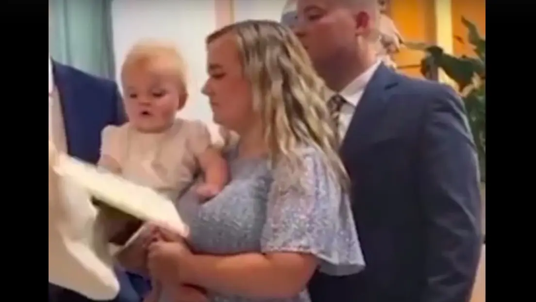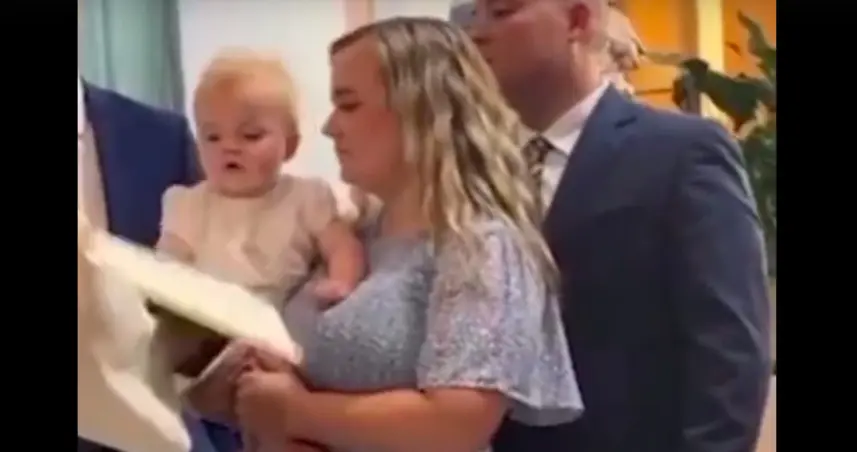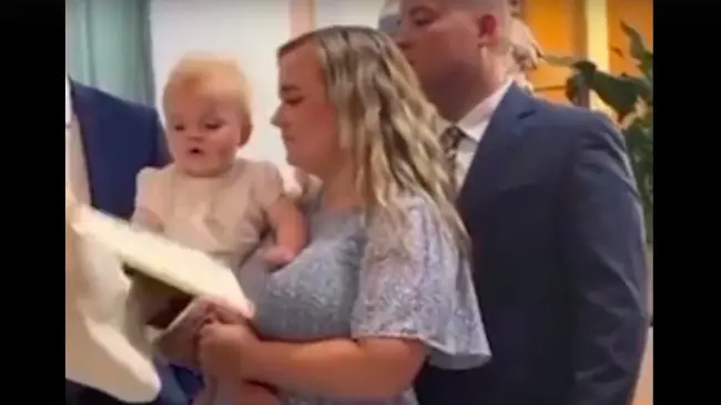 Bebé hace caer la Biblia en una pila de agua bendita en pleno bautizo