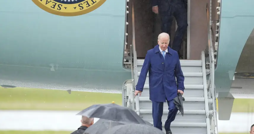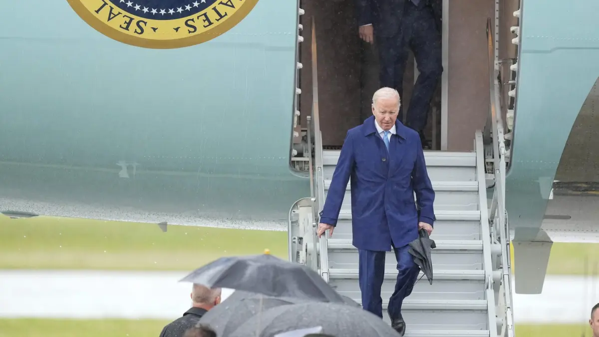 Biden fue el primero en bajar del avión con un paraguas de color negro que llevaba cerrado pese a la lluvia. Le siguieron varios miembros de la comitiva estadounidense, incluido el secretario de Estado, Antony Blinken.