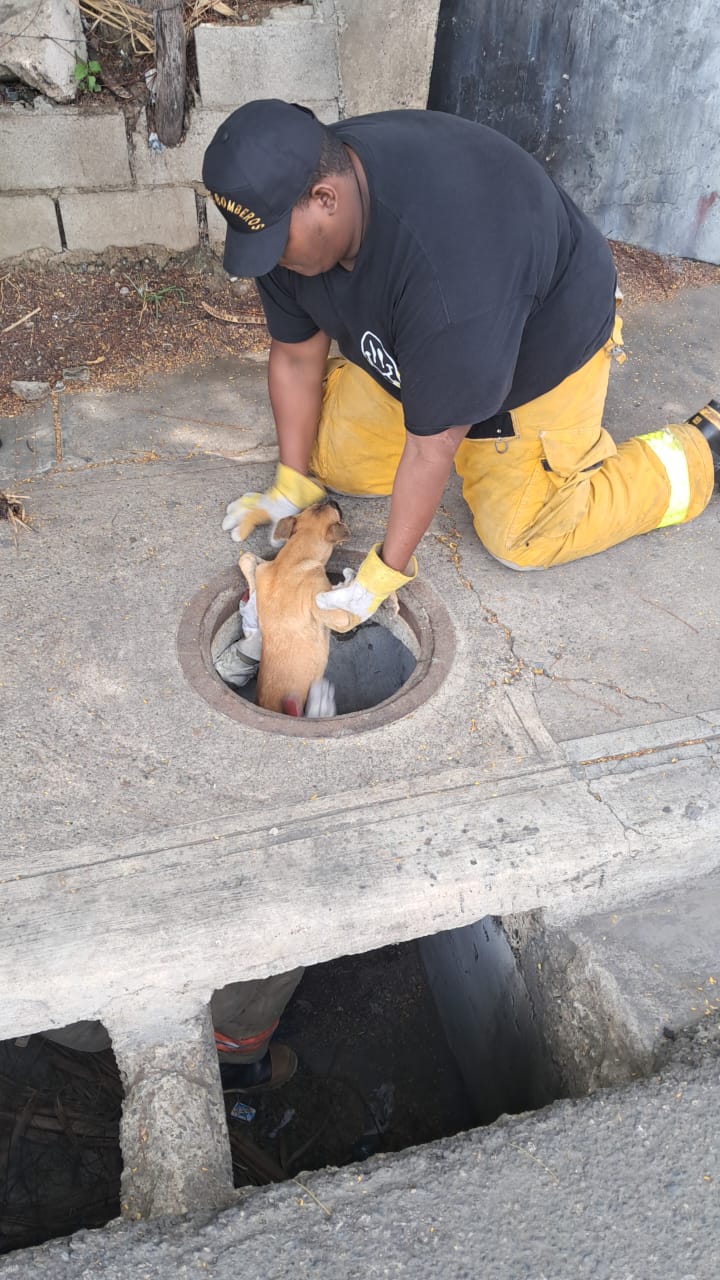 SANTIAGO.- Un equipo de bomberos de Santiago, liderado por el Teniente Coronel Juan Bautista, protagonizó un conmovedor rescate al liberar a un perro que había quedado atrapado en una alcantarilla ubicada detrás del campamento de la OMSA en el sector Ensanche Libertad.