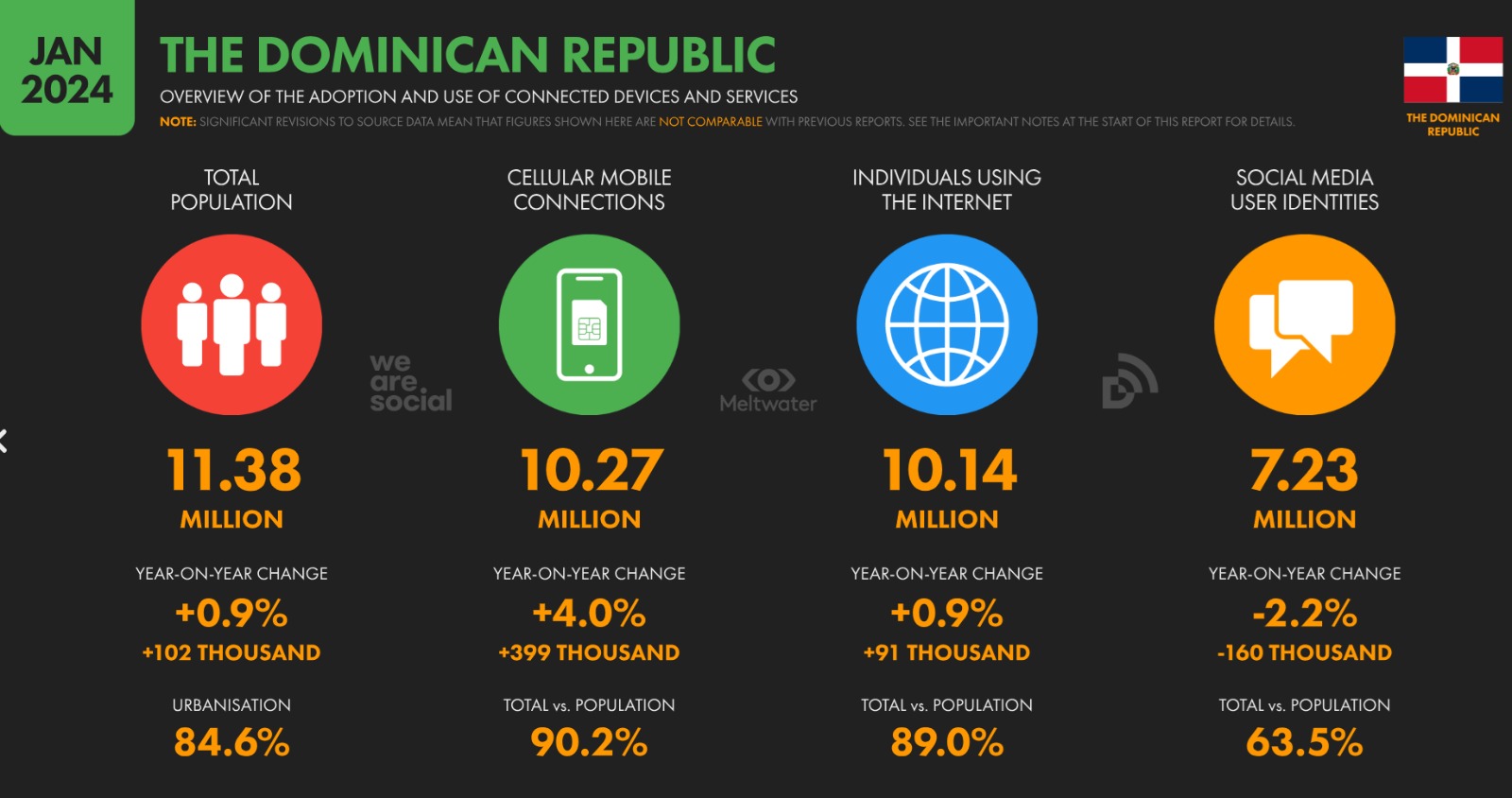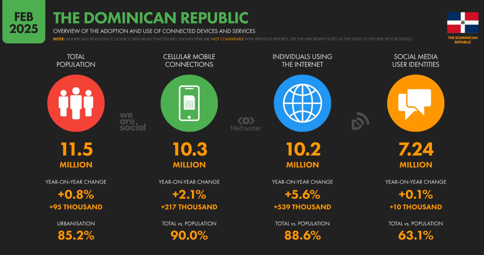 Entre 2024 y 2025, la población dominicana creció de 11.38 millones a 11.5 millones, marcando un incremento del 0.8%. Este crecimiento poblacional estuvo acompañado de un ligero aumento en la urbanización, que pasó del 84.6% al 85.2%, consolidando al país como una de las naciones más urbanizadas de la región. Esta urbanización debería haber favorecido una mayor conectividad, pero los datos muestran una ralentización en el crecimiento de las conexiones móviles y una preocupante estabilización en el uso de redes sociales.