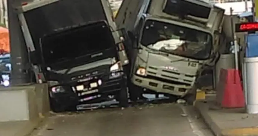 Dos camiones chocaron la mañana de este sábado de manera simultánea con parte de la estructura del peaje de la Autopista Duarte, cuando se dirigían en dirección Cibao-Santo Domingo.