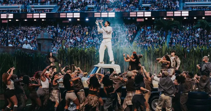 A una actuación repleta de símbolos a su Puerto Rico natal, se sumaron varios artistas como Cardi B, la colombiana Karol G, el chileno Pedro Pascal, Jessica Alba, Young Miko, David Grutman, y la actuación sorpresa de Lady Gaga y Ricky Martin, quienes fueron sus únicos acompañantes vocales en los minutos de espectáculo.