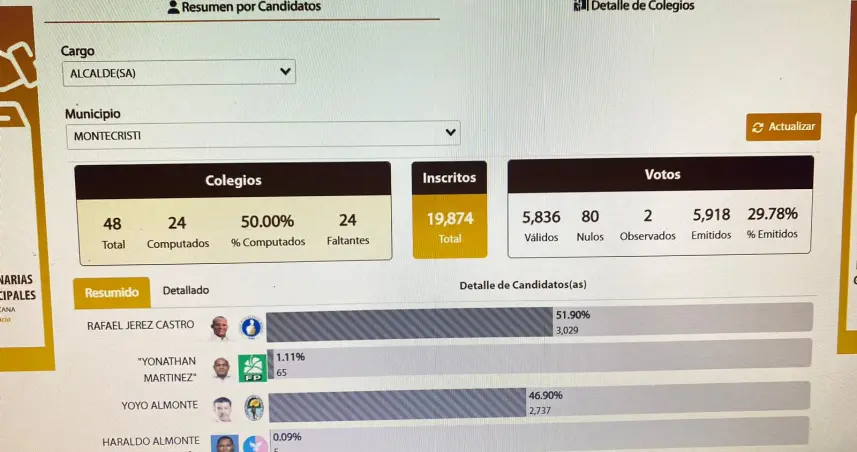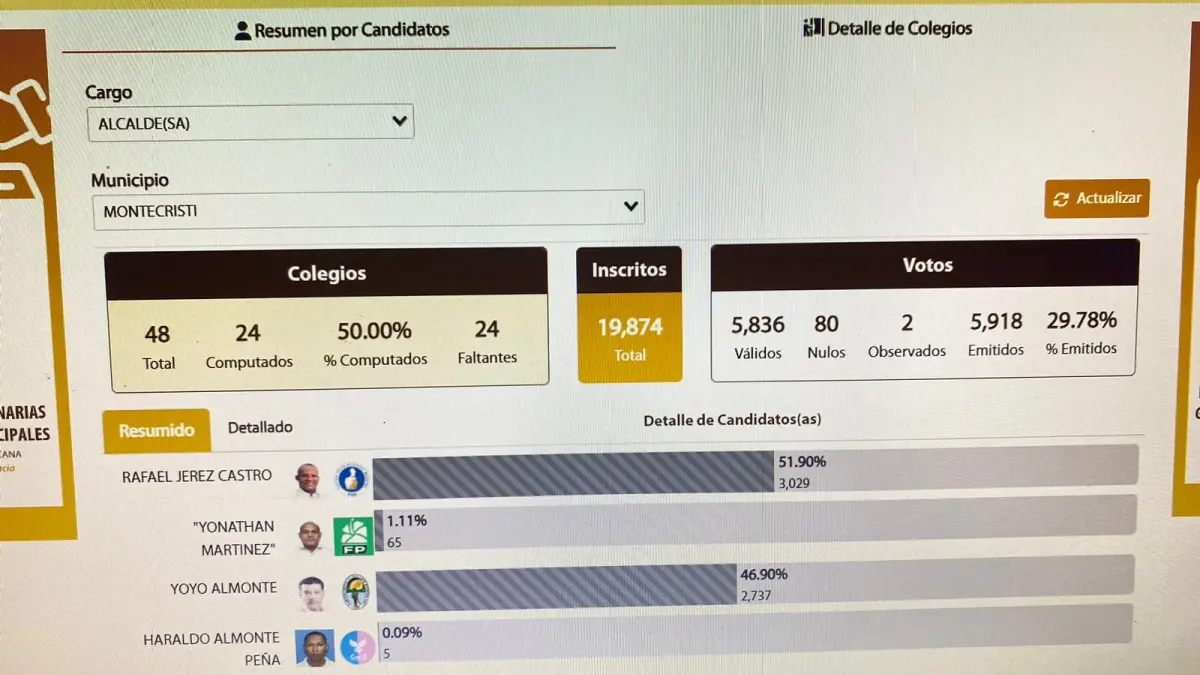 Santo Domingo. -Rafael Jerez Castro, candidato del Partido Revolucionario Moderno (PRM) en Monte Cristi lidera las elecciones municipales, con un 51.90% de acuerdo con el primer boletín emitido por la Junta Central Electoral (JCE), publicado a las 8:00 de la noche de este domingo 18 de febrero.