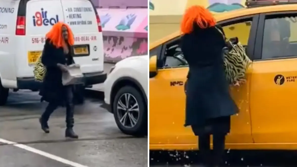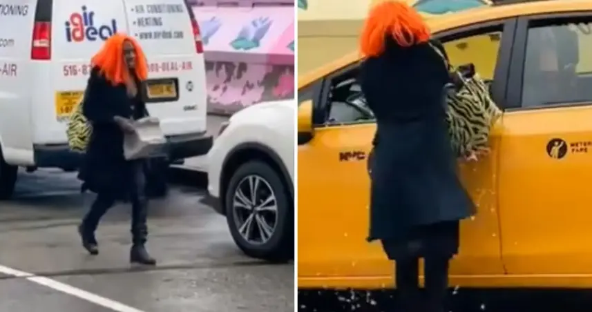 A través de un video que se ha hecho viral en redes sociales, se observa una fémina con peluca naranja caminando por Manhattan cargando un block de cemento para luego romper el cristal del vehículo, y robar artículos que se encontraban en el interior, emprendiendo la huida inmediatamente.