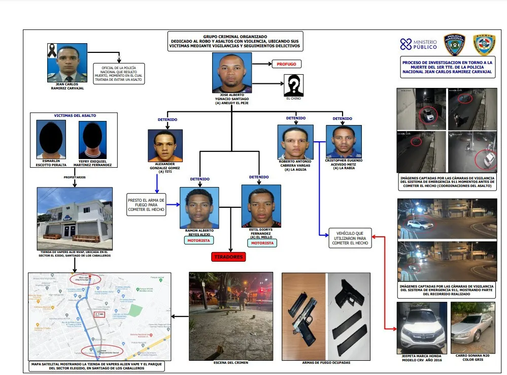 "Después de varios días de investigación la Policía Nacional pudo determinar los autores directos e indirectos de este hecho, que según la institución componen una banda organizada que se dedica a la comisión de atracos, así como también otras actividades ilícitas como el narcotráfico, delito electrónico, entre otros", explicó la institución.