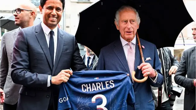 Carlos III recibe una camiseta del PSG de manos de Al Khelaifi