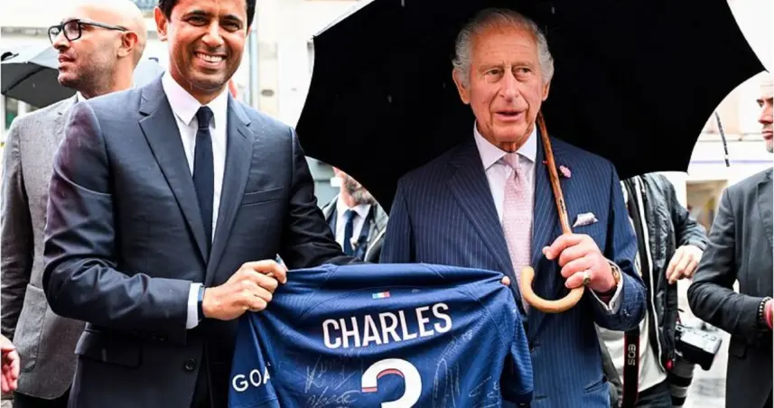 París.- El rey Carlos III del Reino Unido recibió este jueves una camiseta del París Saint-Germain de manos del presidente del club, Nasser Al Khelaifi, durante la visita de Estado que el soberano efectúa a Francia.