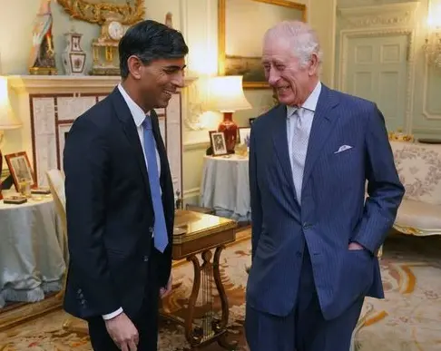 Las cadenas divulgaron imágenes del momento en que Sunak saludó al rey en la residencia real.