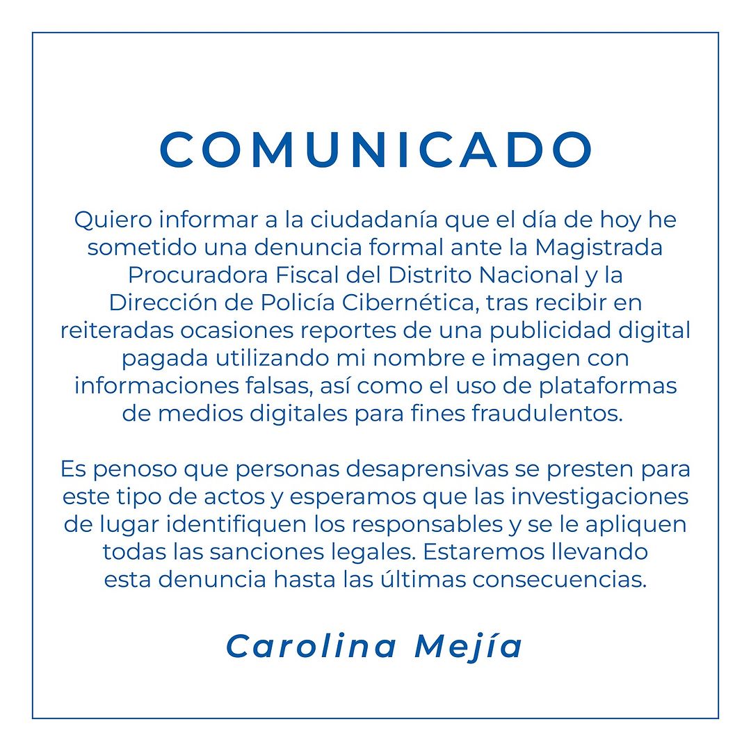 SANTO DOMINGO. La alcaldesa del Distrito Nacional, Carolina Mejía, ha presentado una denuncia formal ante la Procuraduría Fiscal del Distrito Nacional y la Dirección de Policía Cibernética, tras recibir múltiples reportes sobre una publicidad digital engañosa que utiliza su nombre e imagen para difundir informaciones falsas. La denuncia también señala el uso de plataformas digitales con fines fraudulentos.