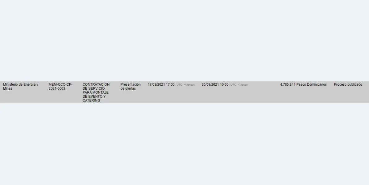 SANTO DOMINGO.- El Ministerio de Energía y Minas gastaría casi cinco millones de pesos en el montaje y el catering de evento, según figura en el portal de Compras y Contrataciones.