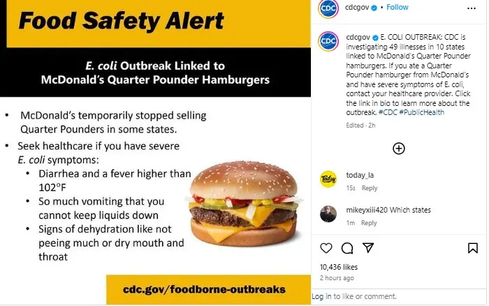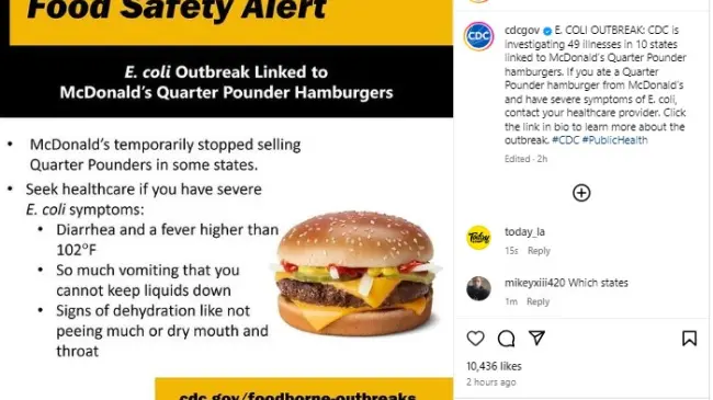 En Estados Unidos, los CDC están haciendo un llamado: “Si usted comió una hamburguesa Quarter Pounder de McDonald's y tiene síntomas graves de E. Coli, comuníquese con su proveedor de atención médica”.