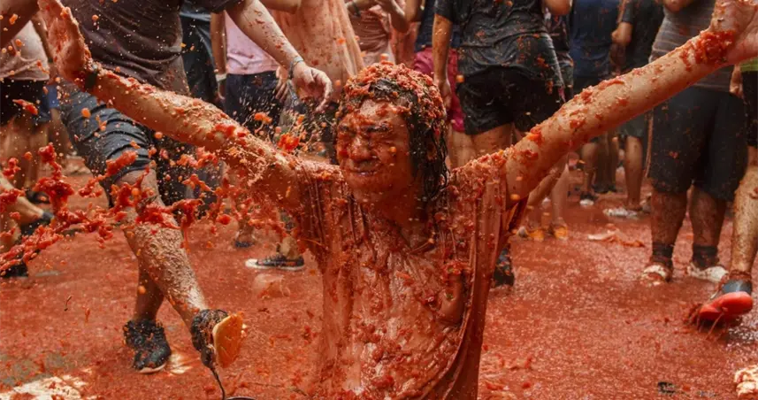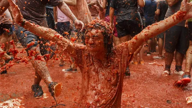 Más de 22,000 personas combaten a tomatazos en la popular fiesta española de la Tomatina