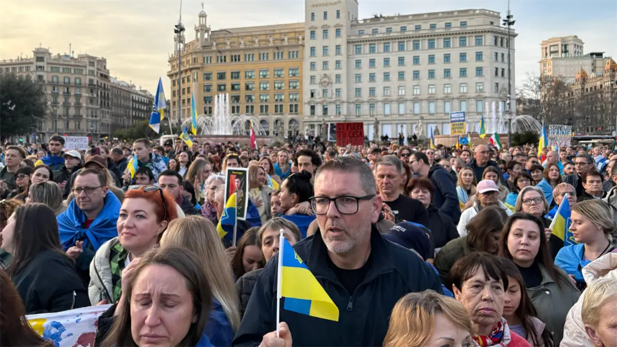 Barcelona.- Centenares de personas han salido este domingo a la calle en Barcelona para pedir ayuda a Europa para acabar con la guerra en Ucrania en una manifestación convocada por la comunidad ucraniana en Cataluña coincidiendo con el cuarto aniversario de la invasión rusa de este país.
