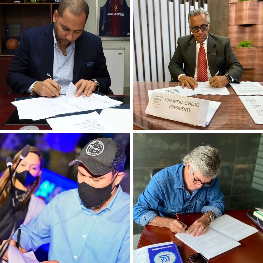 Luis Mejía (DOM), Eduardo Palomo (ESA), Yamil Bukele (ESA) y Mario Durán (ESA), los presidentes de Centro Caribe Sports, el COES, INDES y Alcalde de San Salvador, respectivamente, rubricaron los documentos pertinentes para sellar el convenio.