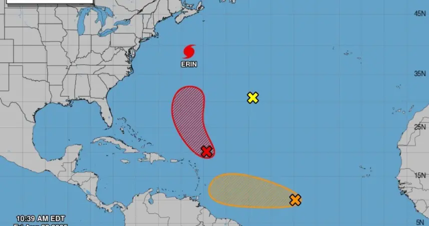 Este es uno de tres sistemas activos que están siendo monitoreados por el NHC, entre ellos el huracán Erin, que se encuentra en el Atlántico noroccidental, y otro sistema más al este, cerca de las islas de Cabo Verde.