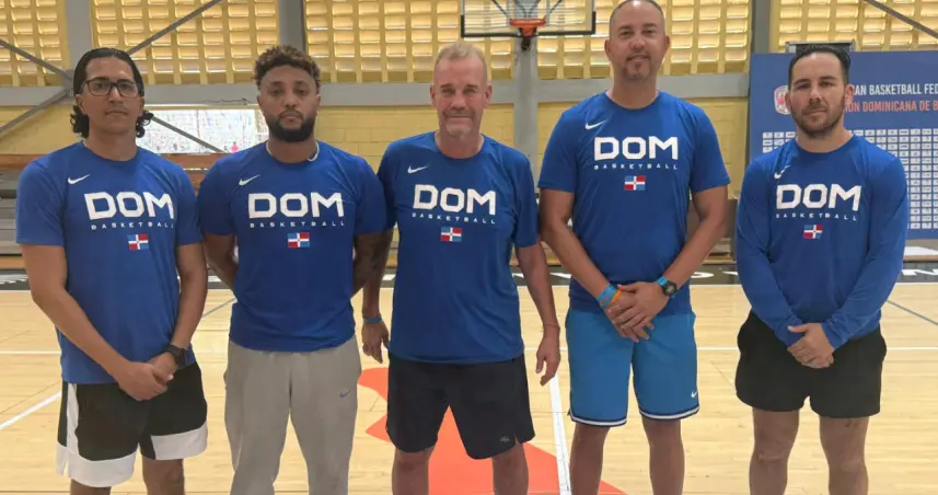 El coach Néstor -Ché- García, al centro, junto al cuerpo técnico que irá al AmeriCup 2025. Desde la izquierda, Abraham Disla, Adenauer Díaz, David Díaz y Martín Luis.