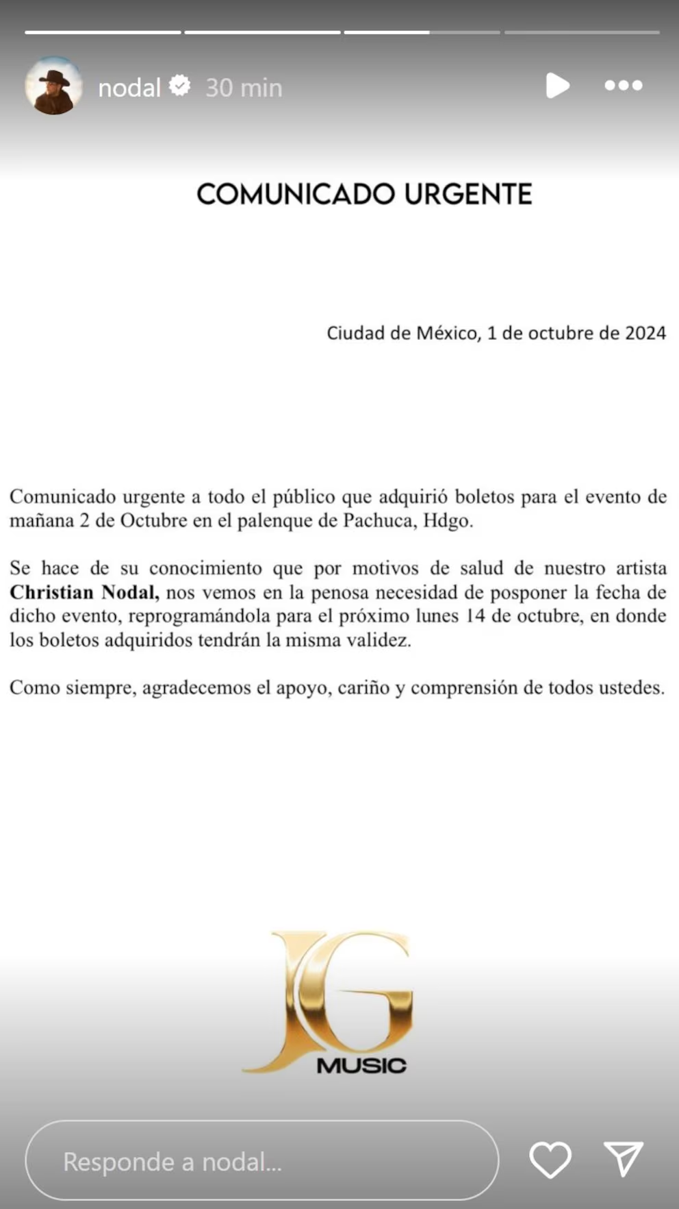 El comunicado oficial está relacionado con su presentación en Pachuca, Hidalgo del próximo 2 de octubre, por lo que se puede leer: “Se hace de su conocimiento que por motivos de salud de nuestro artista Christian Nodal nos vemos en la penosa necesidad de posponer la fecha de dicho evento, reprogramando para el próximo lunes 14 de octubre, en donde los boletos adquiridos tendrán la misma validez”.