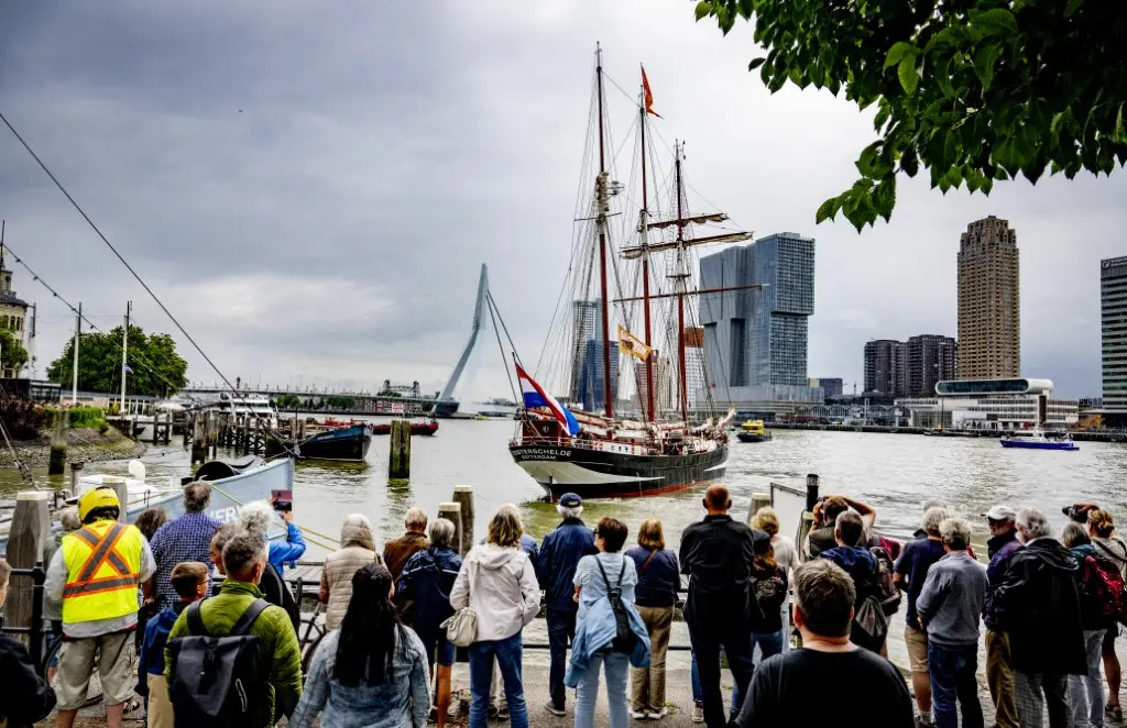 Más de una decena de embarcaciones, desde veleros hasta barcos de vapor, hicieron sonar sus sirenas en honor al «Oosterschelde«, que además recibió los saludos «con cañones de agua» de los barcos de los bomberos, mientras en la orilla cientos de personas vitoreaban a la tripulación.