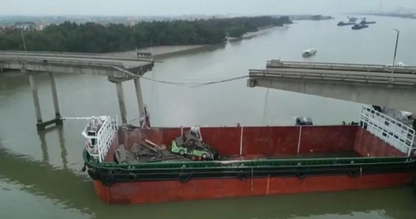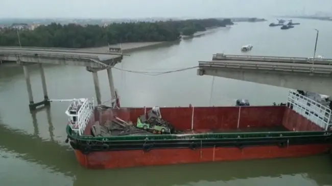 Imágenes retransmitidas por la televisión estatal CCTV muestran los daños causados en la infraestructura después de que el carguero chocase contra el puente por motivos que aún se desconocen.