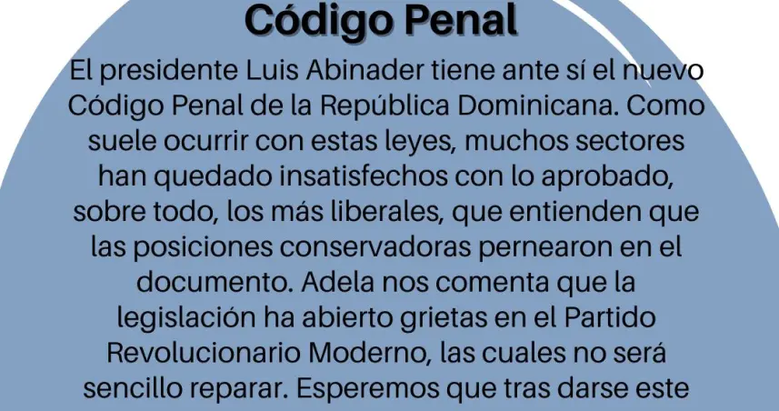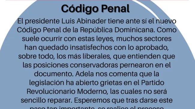 El presidente Luis Abinader tiene ante sí el nuevo Código Penal de la República Dominicana. Como suele ocurrir con estas leyes, muchos sectores han quedado insatisfechos con lo aprobado, sobre todo, los más liberales, que entienden que las posiciones conservadoras pernearon en el documento. Adela nos comenta que la legislación ha abierto grietas en el Partido Revolucionario Moderno, las cuales no será sencillo reparar. Esperemos que tras darse este paso tan importante, se realice el proceso requerido de ver mejoras y someterlas lo antes posible, por el bien de todos.