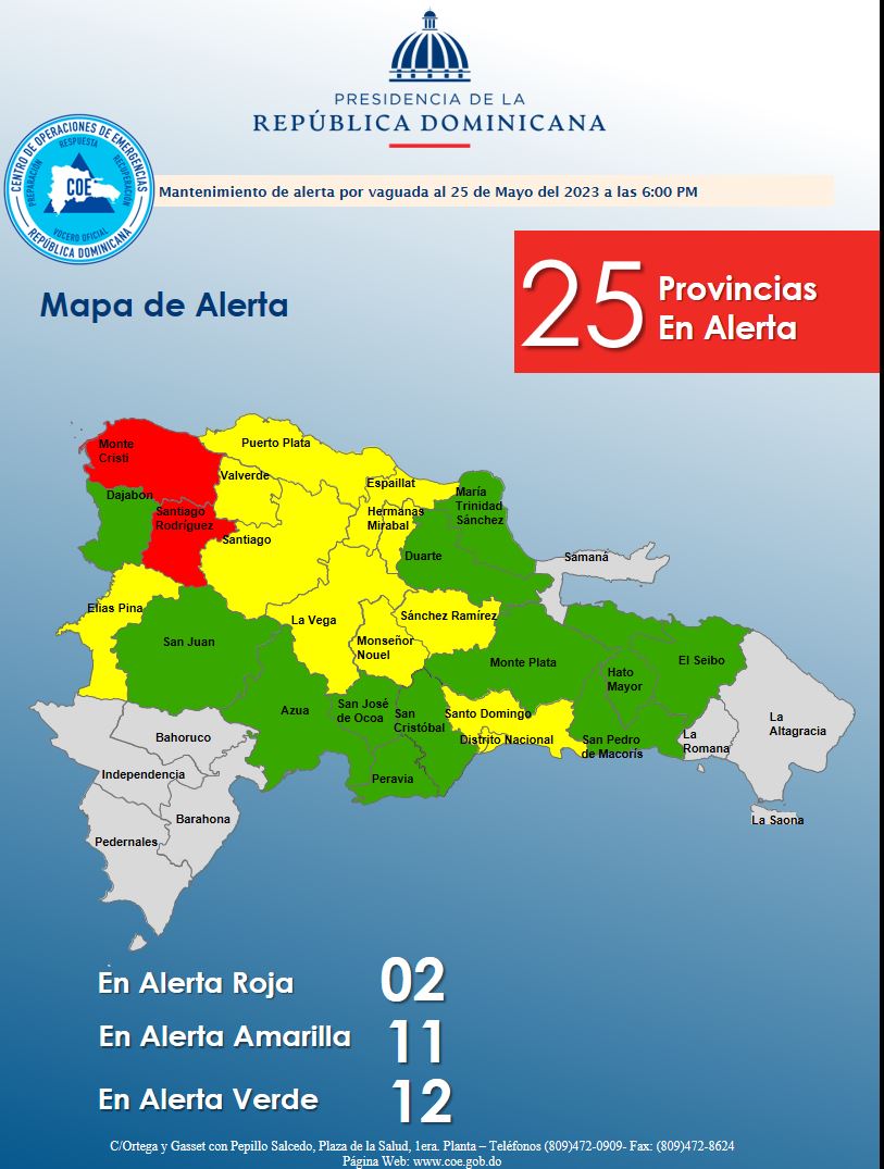 Santo Domingo.– SANTO DOMINGO.- El COE mantiene (25) provincias en alerta, con una pequeña variación en alerta roja 02, 10 en amarilla y coloca 11 en verde, esto debido a las crecidas de ríos, arroyos y cañadas, así como inundaciones repentinas o urbanas, debido a que los efectos de una vaguada seguirán generando aguaceros de moderados a fuertes.