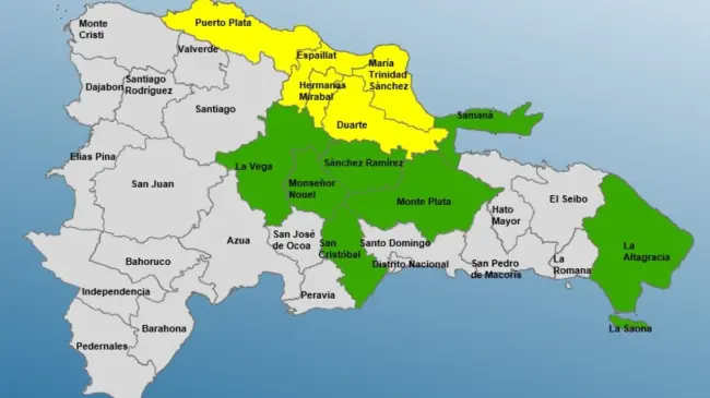 En amarillo están las provincias Espaillat, María Trinidad Sánchez, Duarte, Puerto Plata y Hermanas Mirabal. Mientras que las localidades marcadas con el verde son: La Vega, La Altagracia, Monseñor Nouel, Monte Plata, San Cristóbal, Sánchez Ramírez y Samaná.