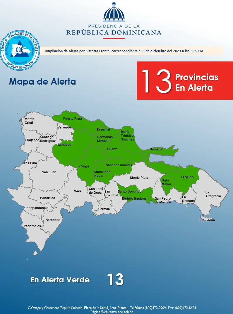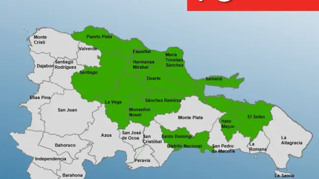Las provincias en alerta verde son: María Trinidad Sánchez, Espaillat, Santiago, Samaná, Hermanas Mirabal, Hato Mayor, Duarte, Puerto Plata, El Seibo, La Vega, Monseñor Nouel, Sánchez Ramírez y el Gran Santo Domingo.