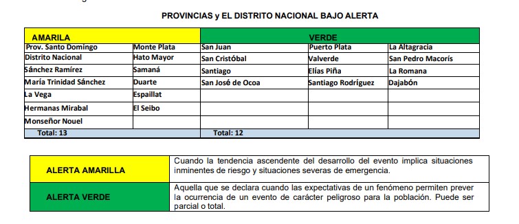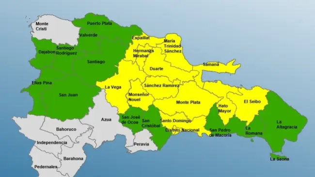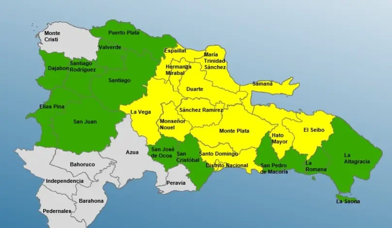 Santo Domingo. - El Centro de Operaciones de Emergencias (COE) aumentó a 13 las provincias en alerta amarilla y a 12 en verde, por una vaguada que está provocando aguaceros de moderados a fuertes, tormentas eléctricas y ráfagas de viento en distintas partes del país.