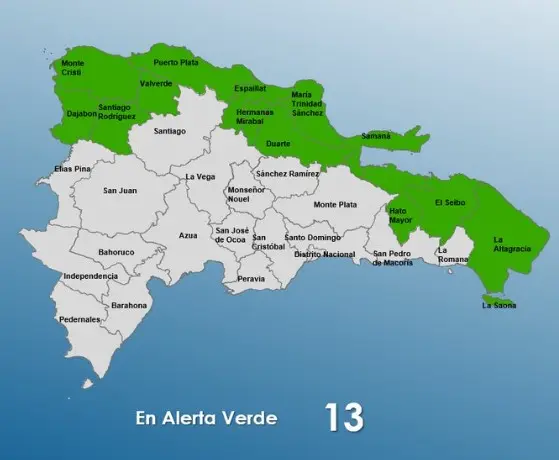 Santo Domingo.- El Centro de Operaciones de Emergencias (COE) aumentó a 13 las provincias en estado de alerta verde, debido a la continua presencia de flujo de viento moderado asociado a una zona de baja presión al noreste del Caribe y efectos orográficos locales.