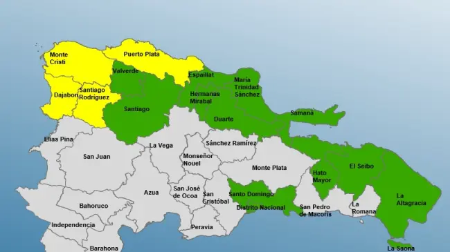 En ese orden, están en alerta verde María Trinidad Sánchez, Espaillat, El Seibo, Samaná, La Altagracia, Valverde, Hermanas Mirabal, Hato Mayor, Duarte, Santiago, la provincia Santo Domingo y el Distrito Nacional.